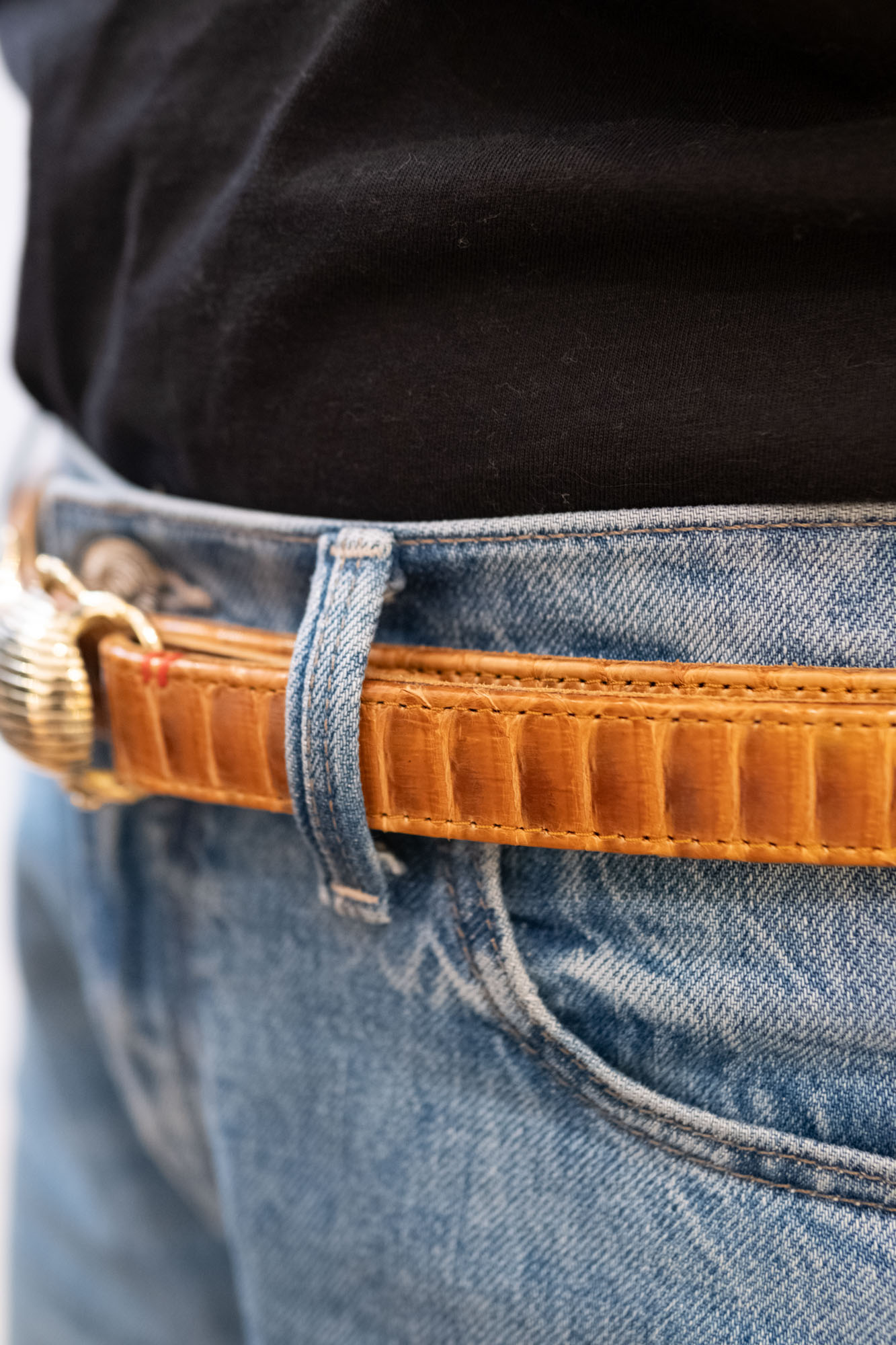 En cuir embossé croco moka, cette ceinture Baby Claris Virot se distingue par sa boucle scarabée dorée. Sa ligne épurée et sa texture raffinée en font l’accessoire parfait pour élever une tenue simple. Parfaite sur une maille légère ou un pantalon fluide.