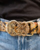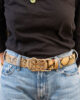 La ceinture Ginkgo Claris Virot en python œil de tigre s’accompagne d’une boucle en forme de feuille, symbole de renaissance et d’équilibre. Un accessoire élégant, parfait pour sublimer une tenue quotidienne ou souligner une taille marquée.