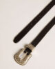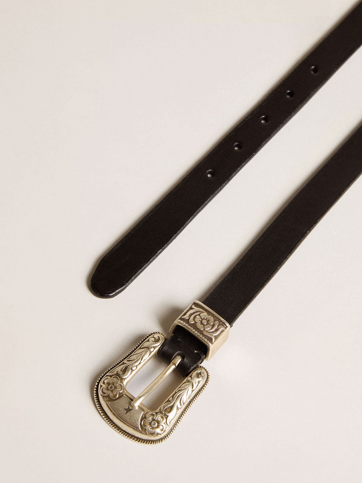 Cette ceinture Golden Goose en cuir lavé noir se distingue par sa boucle argentée gravée et son allure vintage. Polyvalente et raffinée, elle complète aussi bien un jean qu’un pantalon habillé. Un accessoire qui incarne l’esprit rock-chic de la maison italienne.