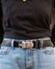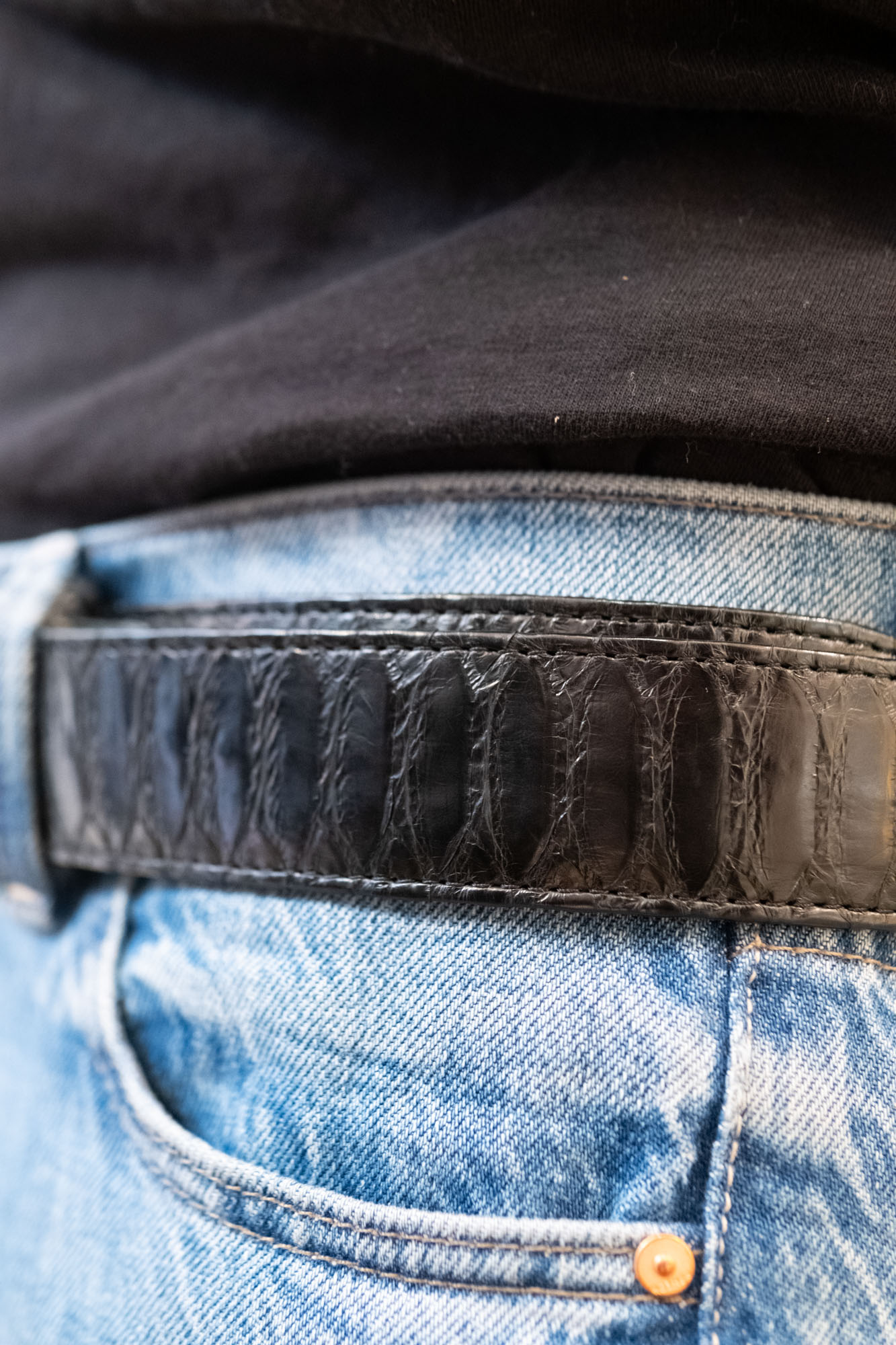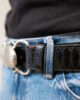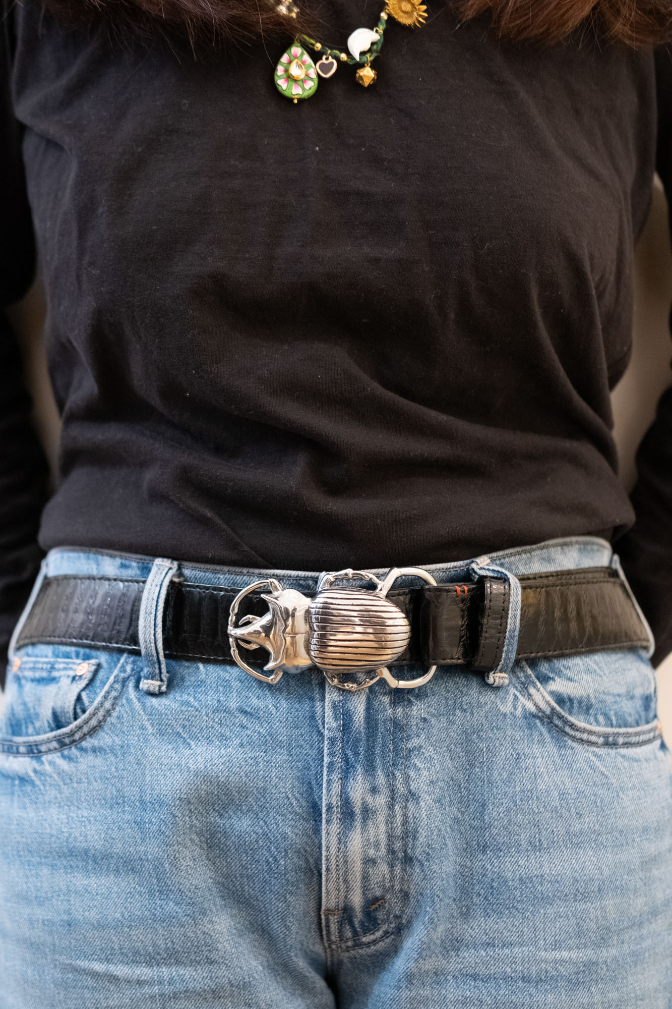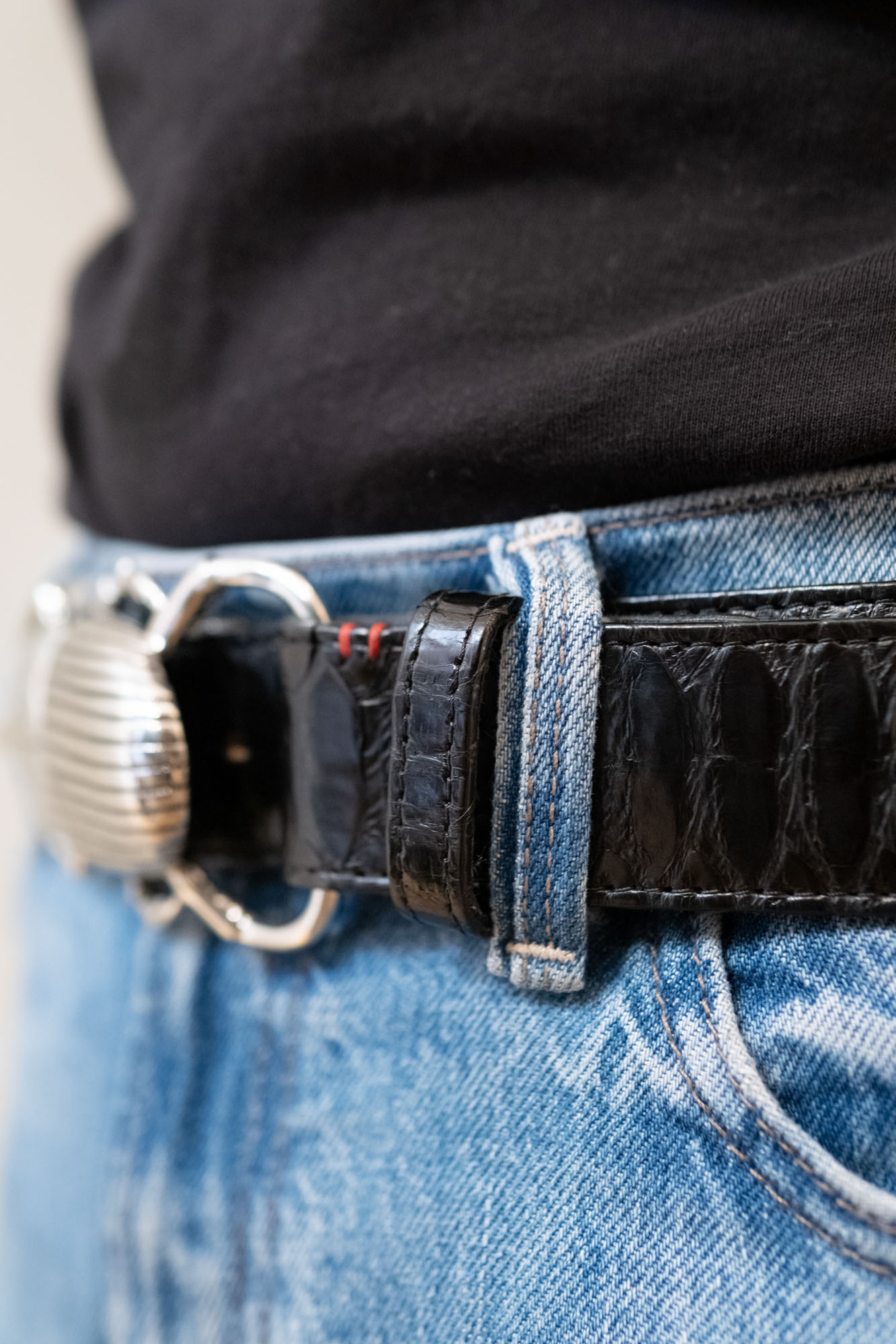 Cette ceinture Claris Virot en croco noir, dotée de la boucle scarabée argentée grand modèle, allie éclat et modernité. Une pièce forte à porter avec un tailleur, une robe près du corps ou un jean pour un twist rock.