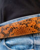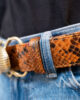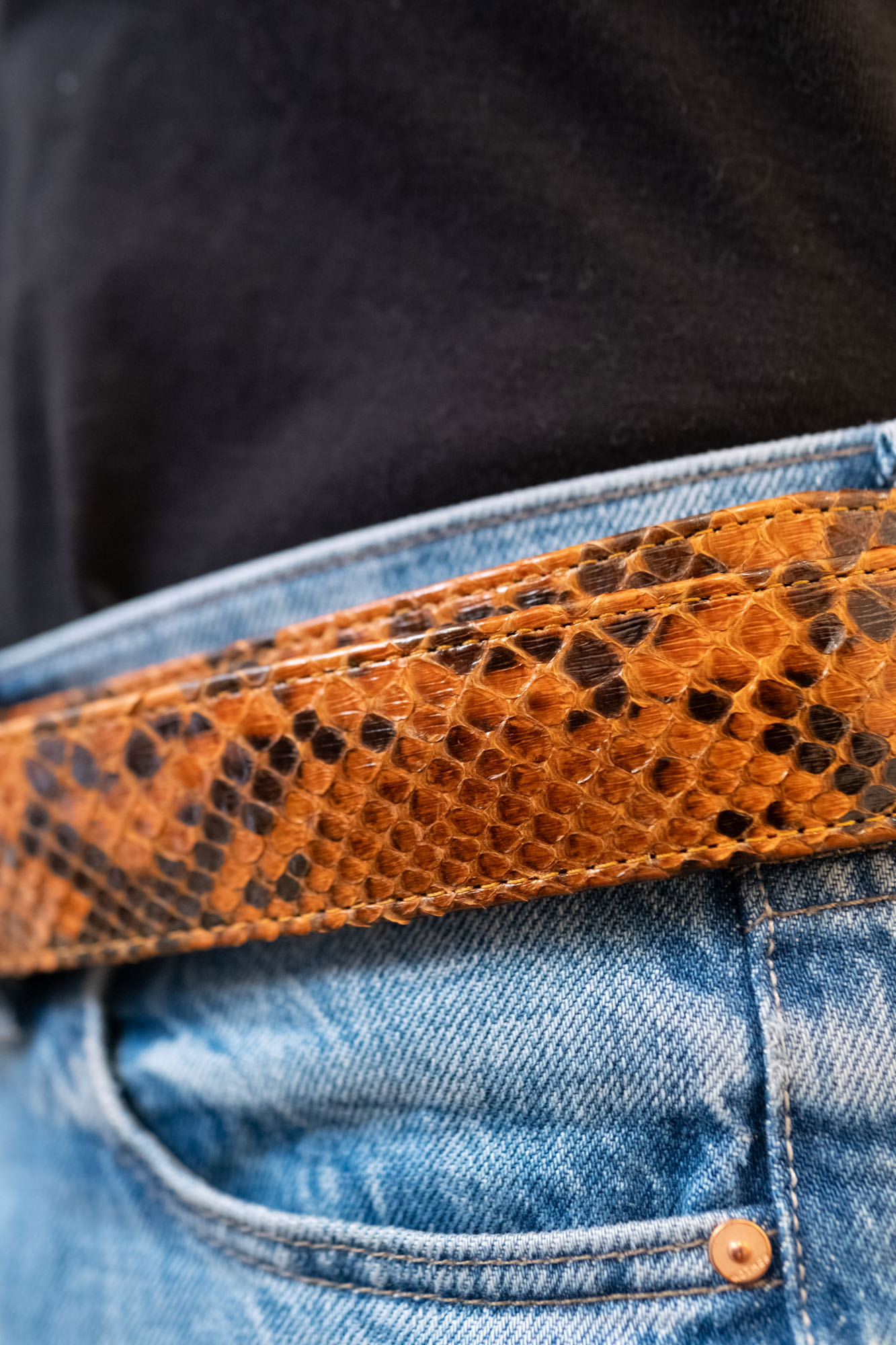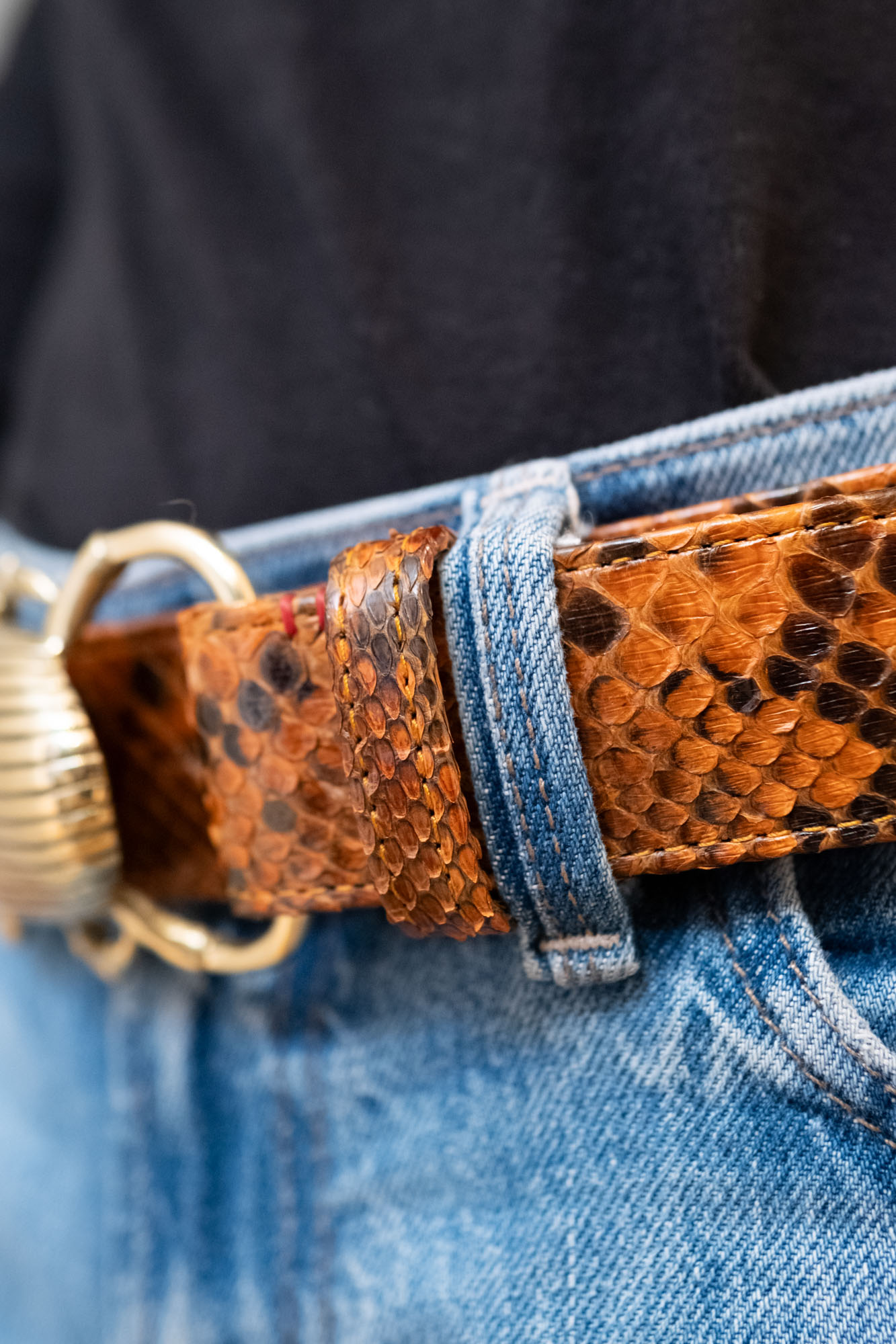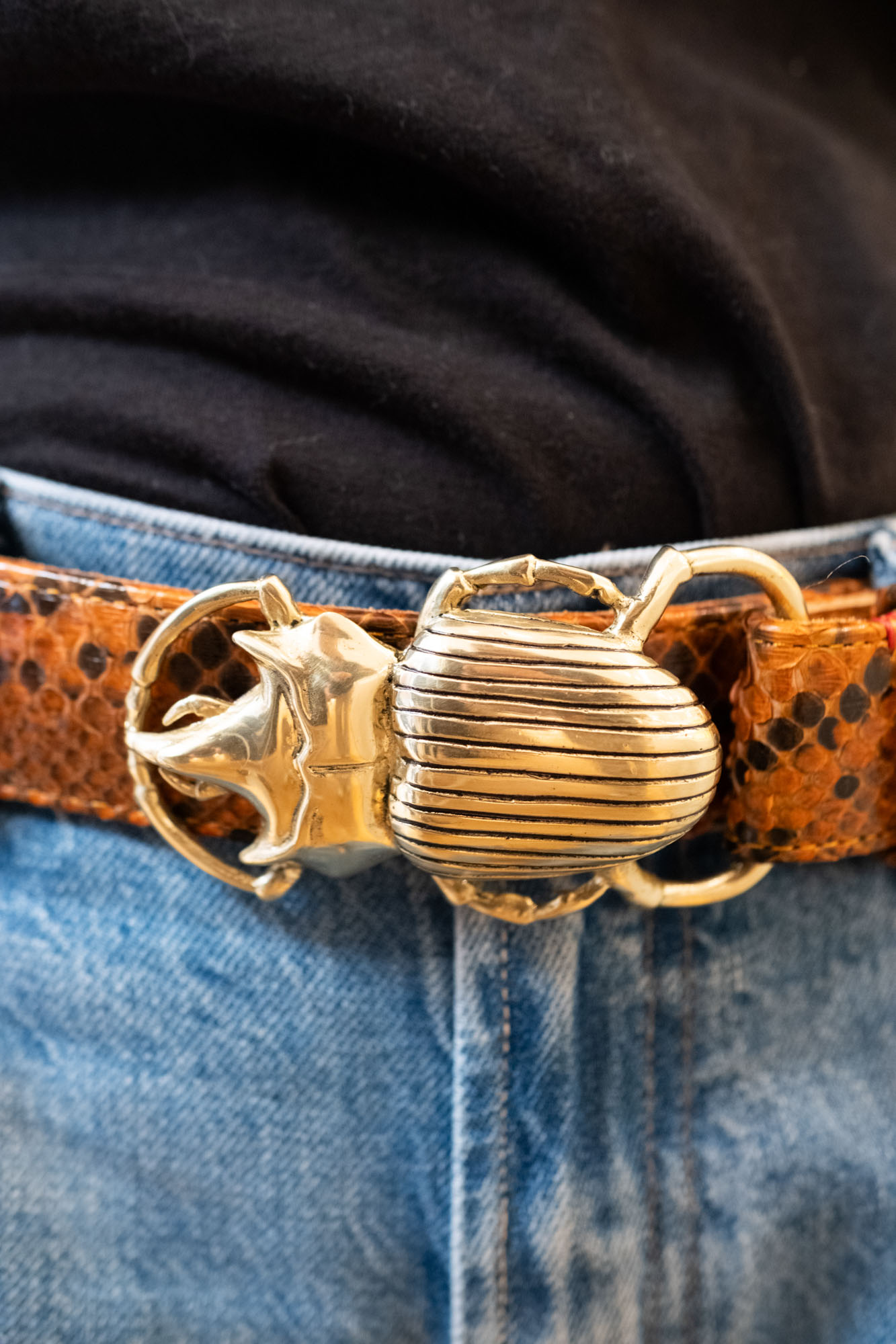 La version python moka de la ceinture Scarabée Claris Virot associe un cuir profond à une boucle dorée sculpturale. Chic et puissante, elle sublime aussi bien les looks monochromes que les silhouettes plus casual.