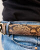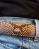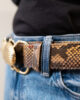 Cette déclinaison reprend le python œil de tigre avec une boucle scarabée dorée grand modèle, parfaite pour celles qui recherchent un accessoire iconique et polyvalent. Idéale pour souligner une taille ou structurer un manteau ample.