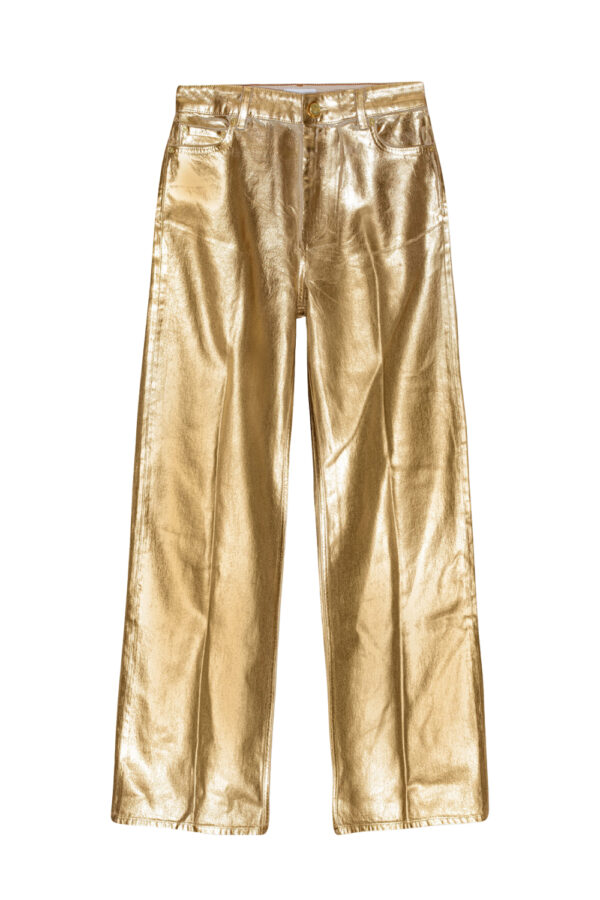Le jean Gold Foil Wide de GANNI se distingue par son design doré éclatant et ses jambes larges, alliant audace et confort. Conçu avec un style à cinq poches, il se ferme à l’aide d’un zip et de boutons et est équipé de passants de ceinture pour un ajustement personnalisé. Le logo GANNI, discretement apposé sur la poche arrière, souligne son identité distinctive. Ce modèle est parfait pour apporter une touche de glamour à votre garde-robe.