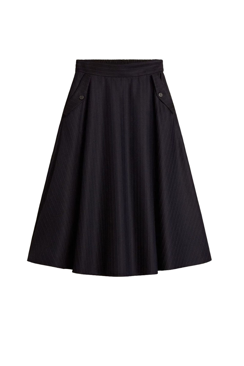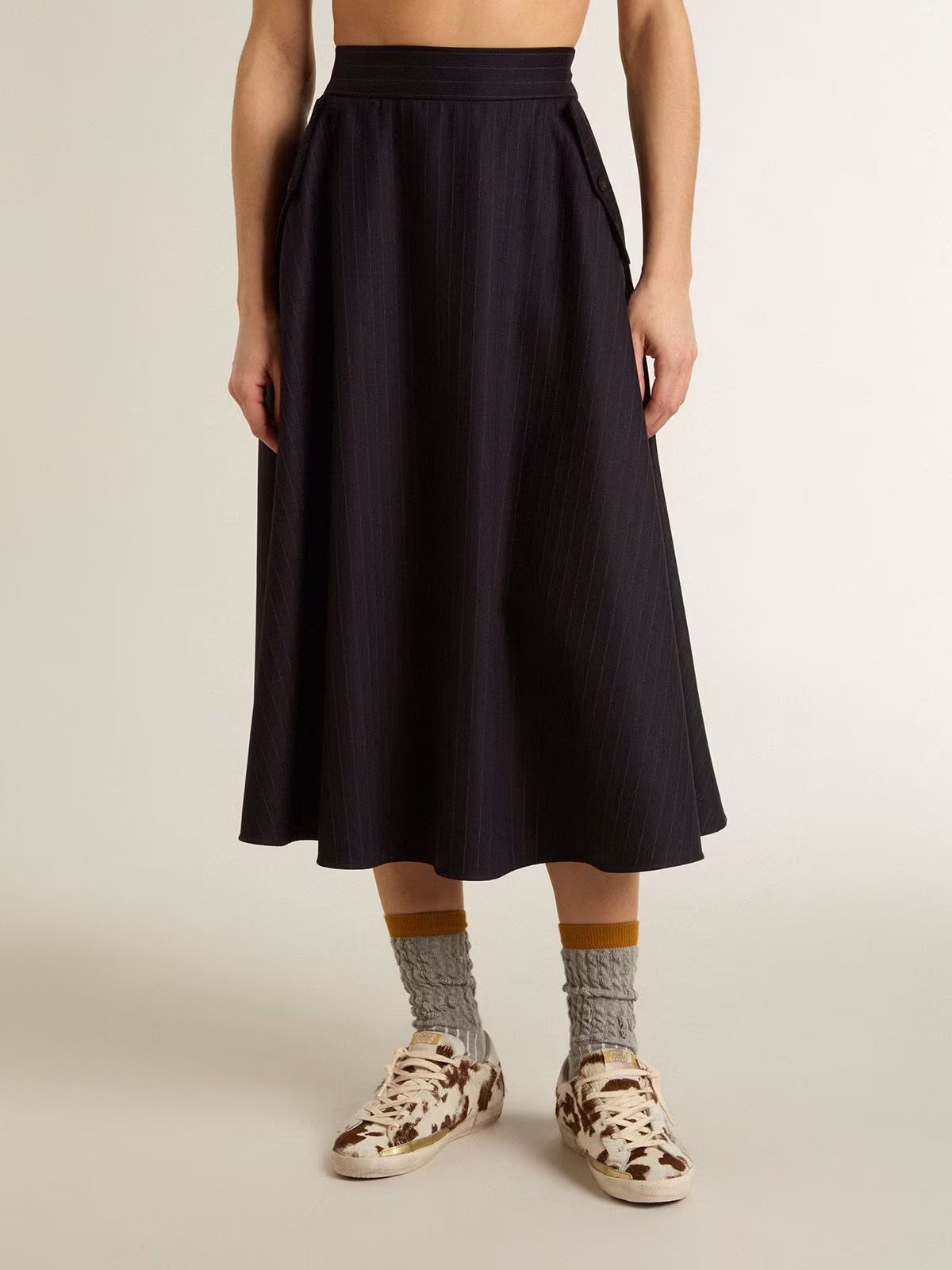La jupe Golden Goose se distingue par son allure preppy revisitée. Confectionnée en laine bleu nuit à fines rayures tennis, elle évoque un style à la fois chic et décontracté. À associer à une maille oversize ou un blazer pour un look sophistiqué.