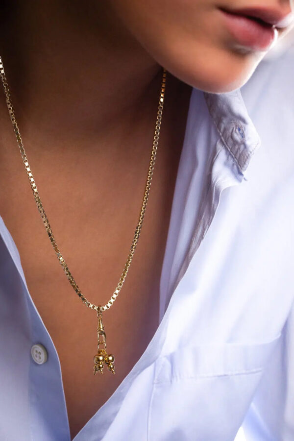 Collier sautoir modèle Line de la marque française Luj. Fait entièrement à la main à Paris, ce collier est composé d’une chaîne en maille vénitienne et d’un pendentif avec mousqueton et grands grelots. Il peut être associé à d’autres colliers de la marque pour un look original
