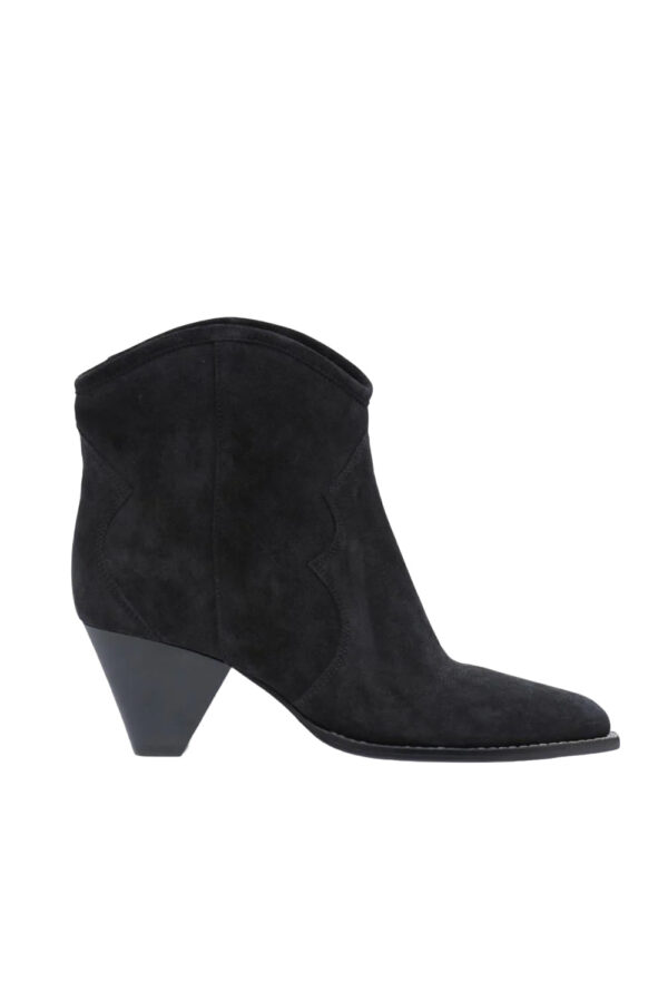 La boots santiag Darizo, en cuir veau velours, est ornée d’empiècements arrondis et de surpiqûres. Elle présente un bout pointu et un talon conique. Les semelles, à la fois extérieure et intérieure, sont en cuir, tout comme la doublure. Hauteur des talons : 6 cm.