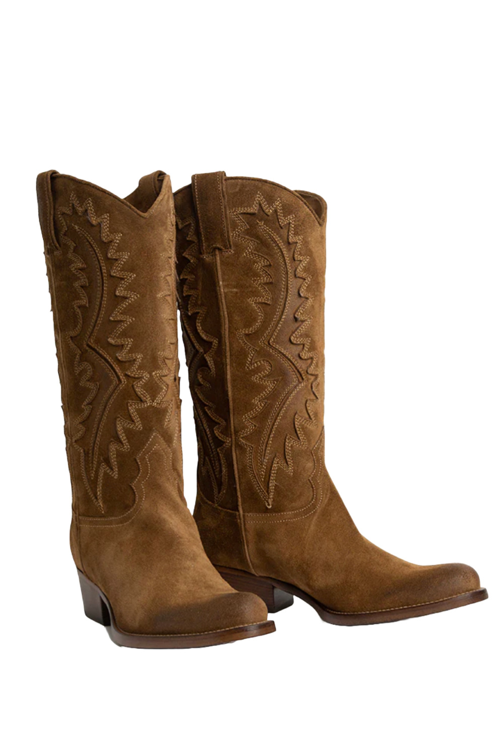 Les bottes western Sartore, en daim couleur cognac, sont dotées d’un talon biseauté et d’une semelle en cuir. Hauteur du talon : 4,5cm.