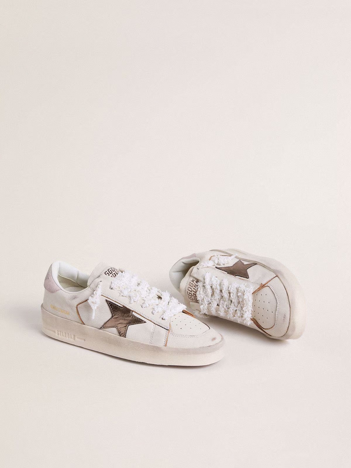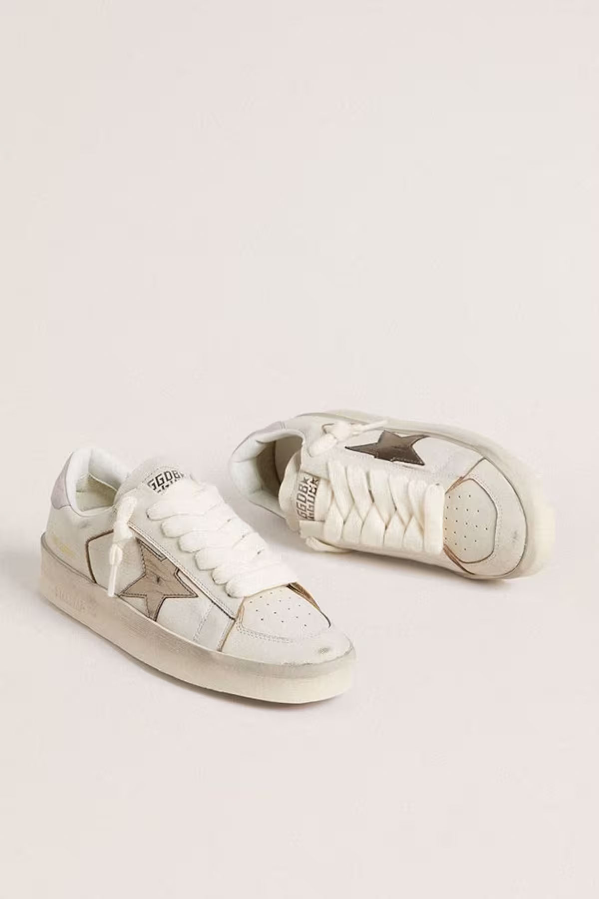 Les baskets Stardan Golden Goose affichent une allure rétro inspirée des modèles de sport vintage. Réalisées en cuir nappa blanc avec étoile argentée et contrefort rose, elles allient audace et confort. À porter avec un jean ou une robe pour une touche casual-chic.