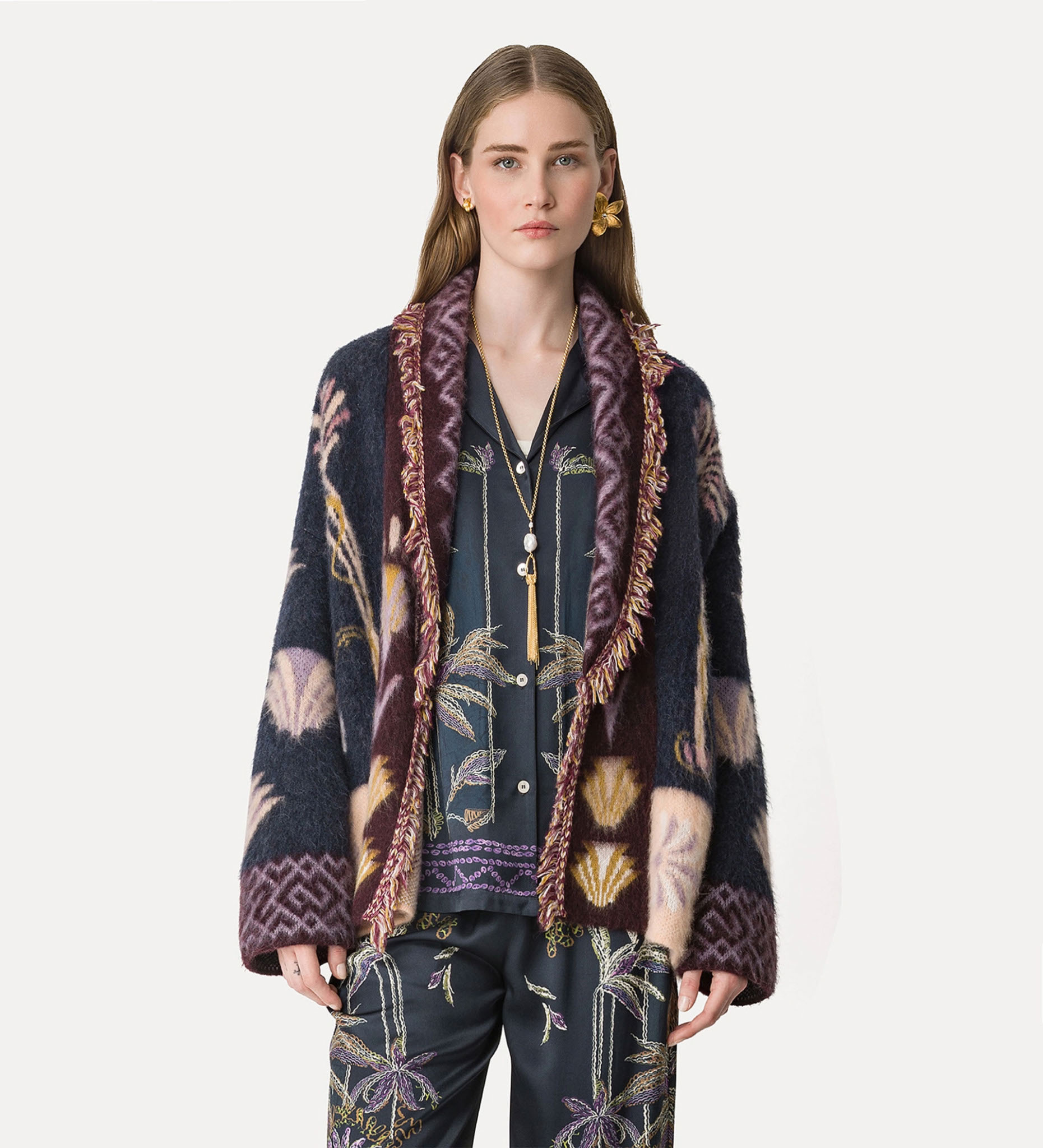 Ce cardigan long Forte Forte est une pièce enveloppante en laine et bébé alpaga, à la douceur incomparable. Ses motifs aux tons naturels et sa texture duveteuse lui donnent un charme artisanal et bohème. À porter ouvert sur une robe fluide ou un jean, pour une allure chic et décontractée.