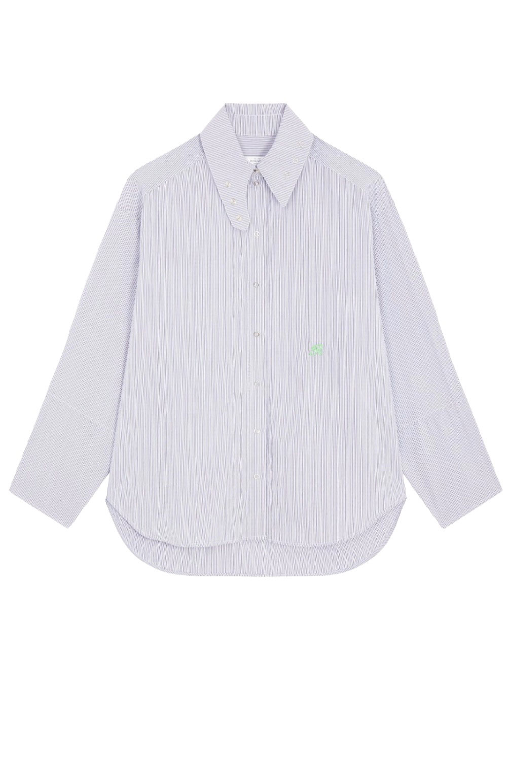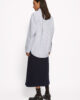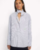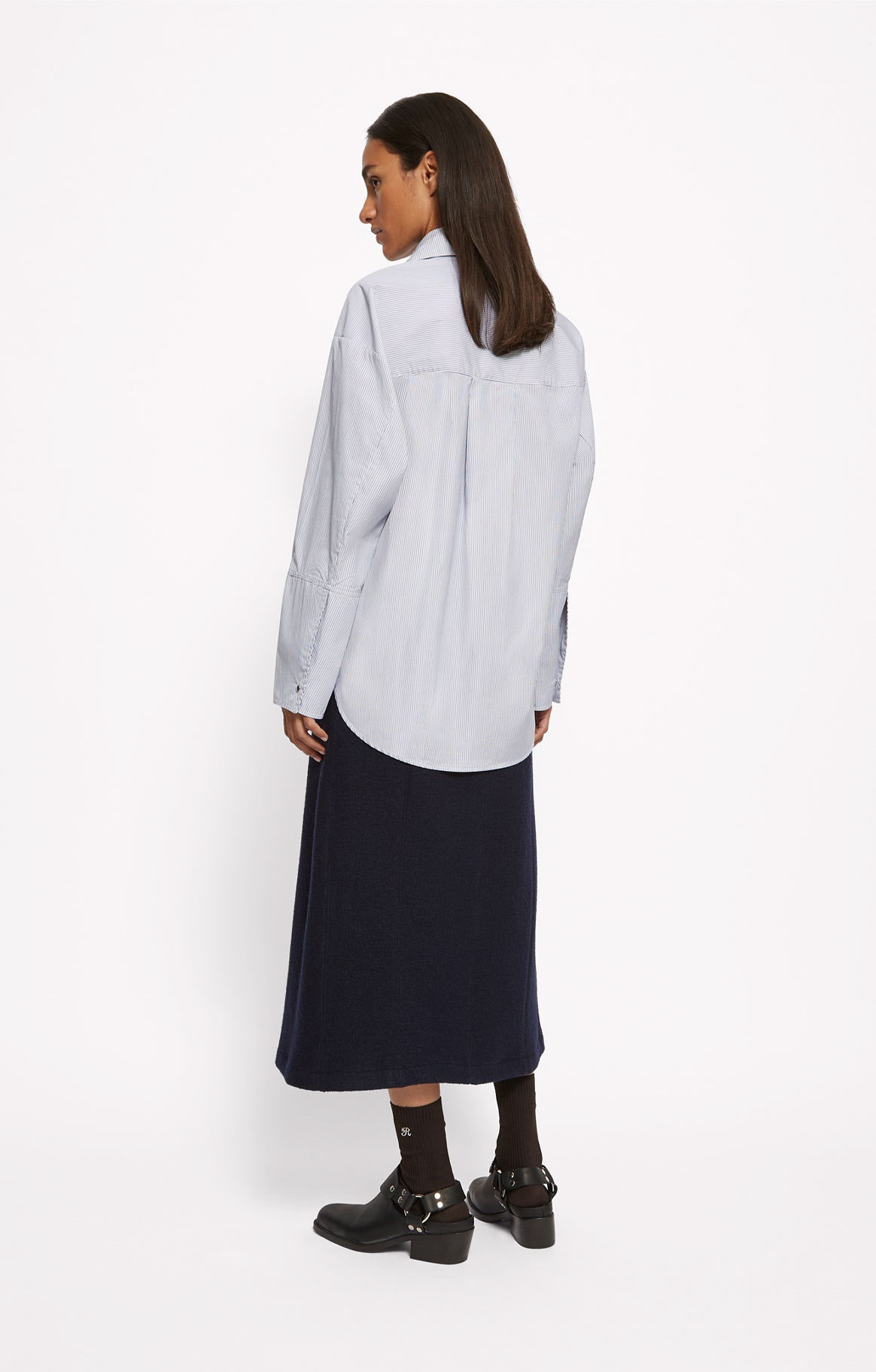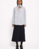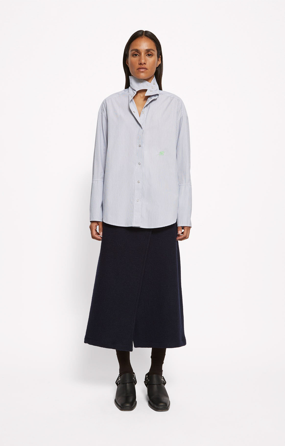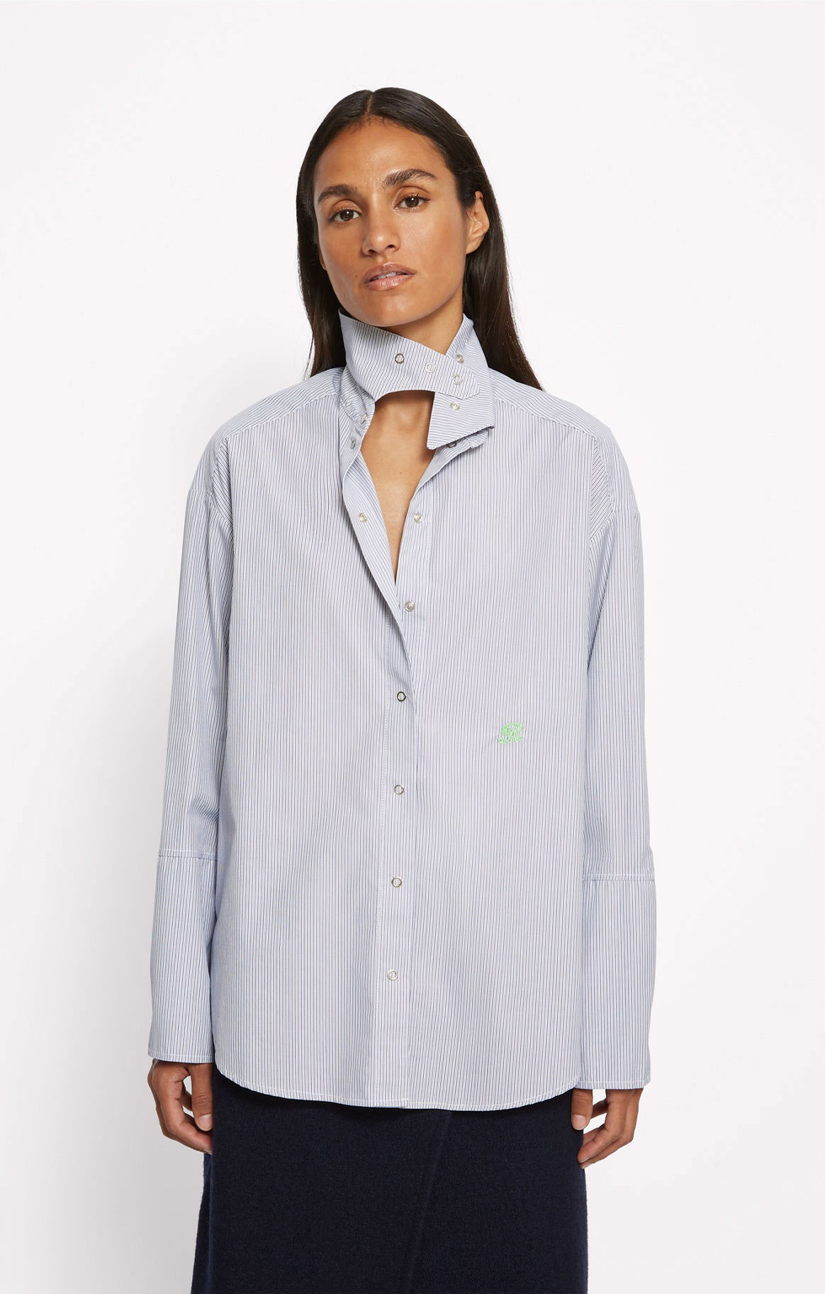 La chemise Ally signée Roseanna se distingue par sa coupe droite et ample, son col montant structuré et sa mentonnière intégrée. Confectionnée dans un tissu bleu uni, elle se ferme par des boutons pression métalliques pour une touche contemporaine. Une pièce polyvalente et moderne qui se porte aussi bien rentrée dans un pantalon que superposée sur un t-shirt.