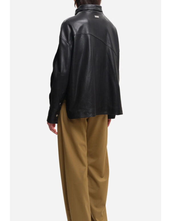 La chemise Egan en cuir noir de Margaux Lonnberg incarne une féminité affirmée et contemporaine. Sa coupe trapèze oversize, son col asymétrique et son boutonnage décalé en font une pièce mode au caractère fort. À porter en veste sur un t-shirt ou fermée pour un look rock et sophistiqué.