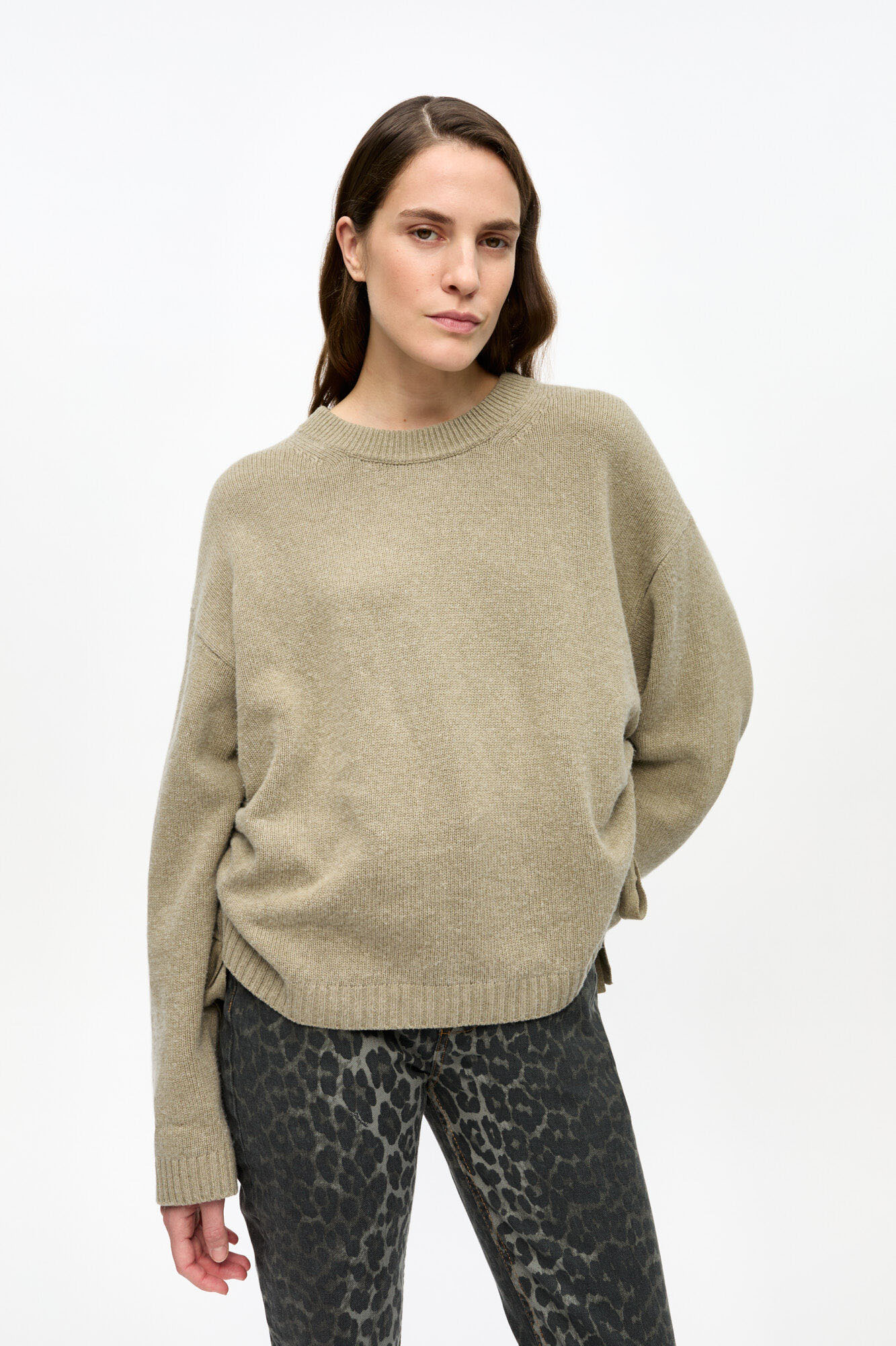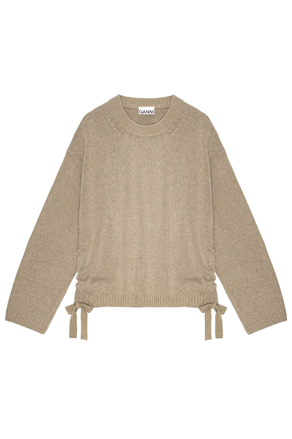 Ce pull Ganni en laine mélangée présente une maille moelleuse soulignée de nœuds délicats. Sa teinte beige douce s’accorde avec tout, pour une allure cosy et naturelle. À porter aussi bien avec un jean brut qu’une jupe longue.