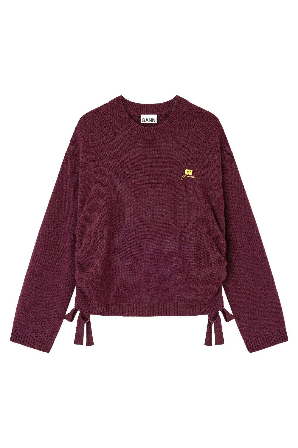 Le pull Ganni séduit par ses détails féminins : des petits nœuds ton sur ton qui viennent rythmer la maille douce et moelleuse. Sa couleur bordeaux réchauffe la silhouette avec élégance. Parfait avec un pantalon en cuir ou une jupe fluide pour un style moderne et raffiné.