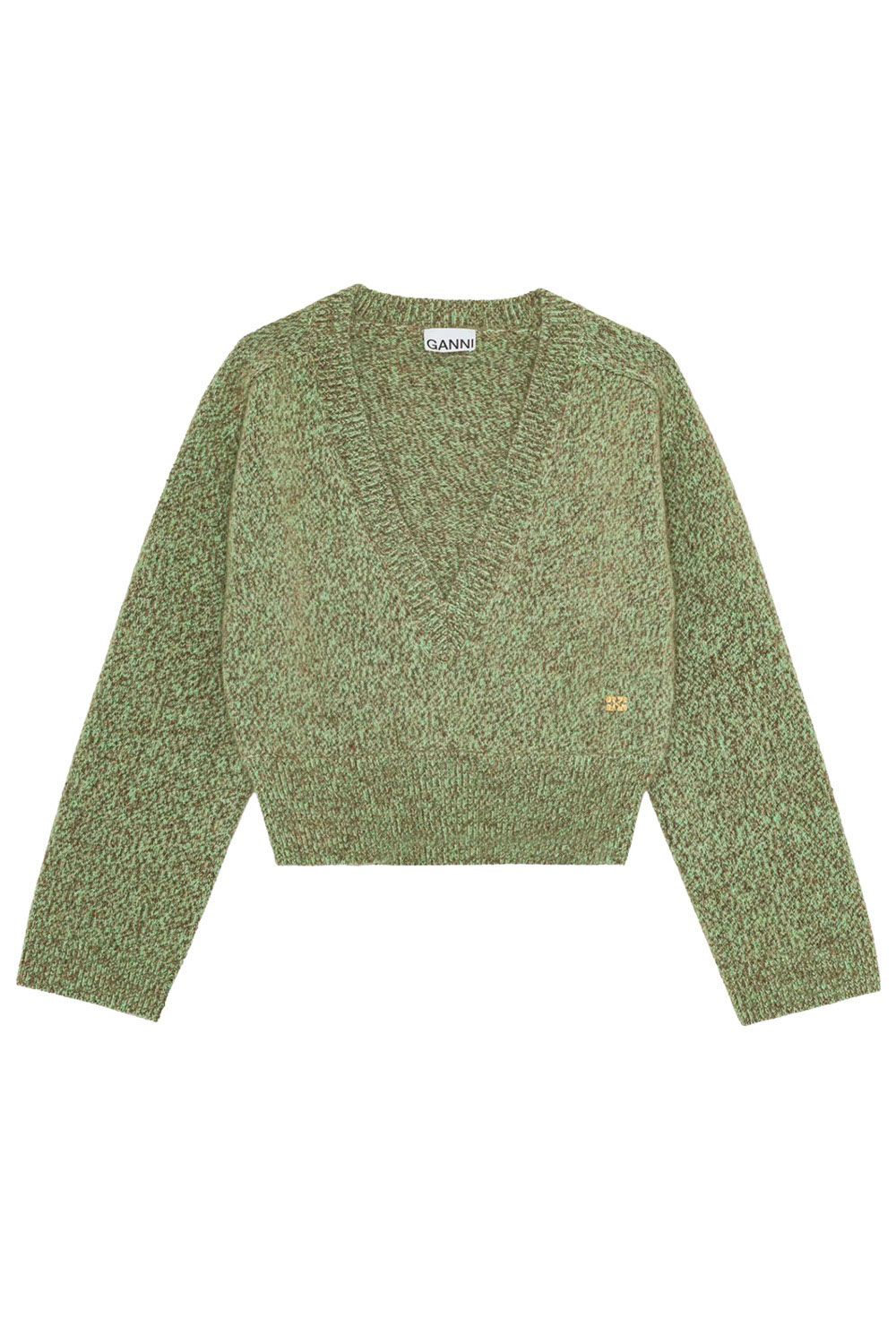 Ce pull col V Ganni en maille mélangée séduit par sa teinte vert tendre et sa texture brossée. Sa coupe légèrement oversize et son col profond apportent une touche de décontraction élégante. À superposer sur une chemise blanche ou porté seul avec un jean.