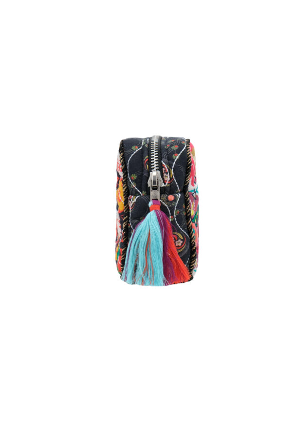 Découvrez la Mini Pouch Miraflores de chez Monoki en coton avec des imprimés colorés. Cette pochette, rembourrée pour plus de confort, est décorée sur le devant, d’un fer à cheval et du mot « blessed ». Au dos, on trouve une belle illustration d’un paysage avec des chevaux, un soleil, des nuages, du vent et de la pluie. La couleur principale de cette pochette est le rouge apportant une touche vive et joyeuse à cet accessoire. Cette pochette est parfaite pour ranger tous vos produits de skincare lors de vos voyages ou à mettre dans votre sac cabas pour ranger vos clés ou votre téléphone.