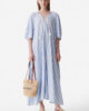 Confectionnée dans un mélange de viscose et de lin, la robe Brooklyn Vanessa Bruno blanche à rayures bleues ciel ajoutera une touche de fraîcheur à votre garde-robe estivale. Ample, longue et évasée, elle offre un confort léger et aéré pour les journées ensoleillées. Son encolure tunisienne ornée de liens avec pompons apporte une touche bohème chic, tandis que ses manches 3/4 larges et ses détails de fronces au dos ajoutent du volume et du mouvement à la silhouette.