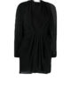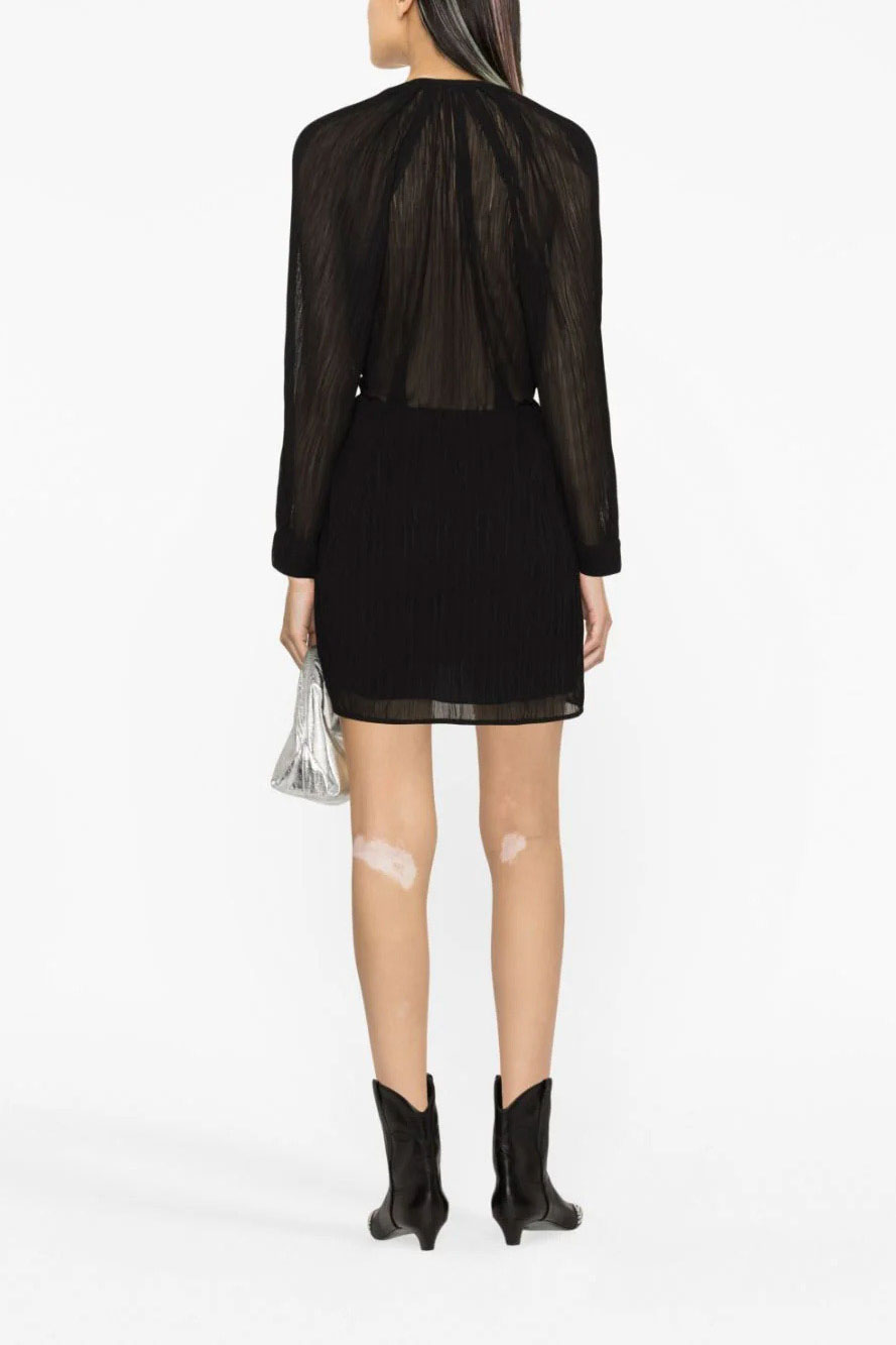 Robe noire modèle Alvina de chez Iro. Cette robe courte drapée possède des manches transparentes et un col géométrique qui met en valeur le creux du cou et le décolleté. On l’imagine portée avec des bottines pour une allure rock.