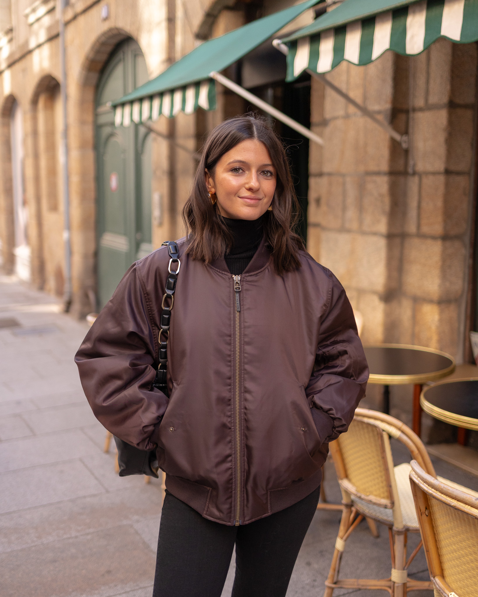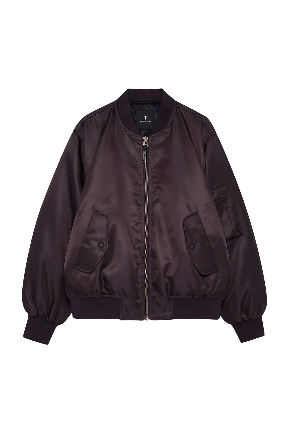 Le bomber Leon d’Anine Bing se décline ici dans une teinte chocolat profonde et élégante. Confectionné dans une matière satinée, il combine allure décontractée et finition raffinée. Sa coupe légèrement oversize et ses détails utilitaires lui confèrent un style contemporain parfait pour la mi-saison.